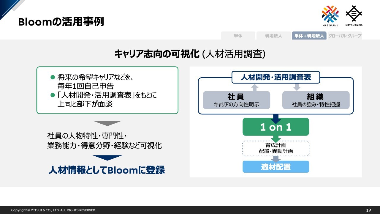 活用の実例としては、海外で採用された社員が、国を超えた異動の際に自分のメンターになってくれる人をBloomで探し、そのメンターをロールモデルとして自分のキャリアを考えるといった効果も出てきています。ただ、Bloomを通じて適材配置がしっかりとできているかを統計的に分析できるようになるには、もう少し時間がかかると考えています。