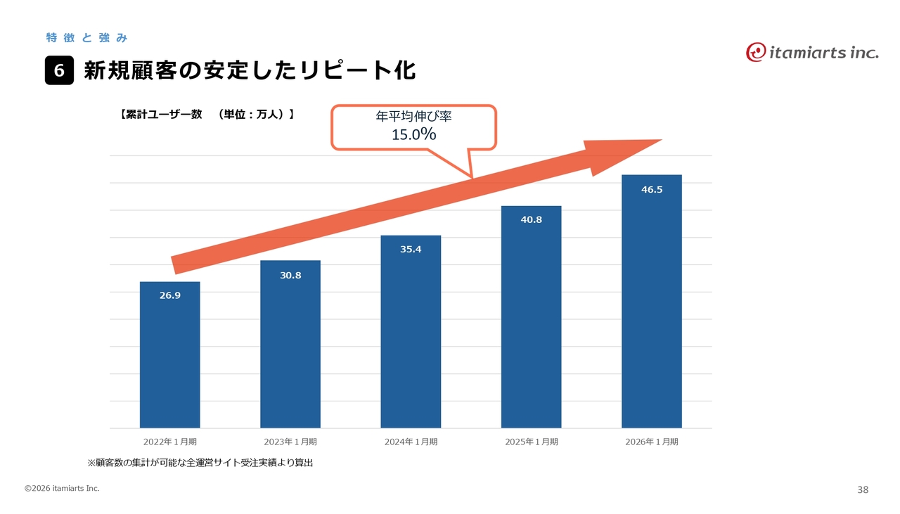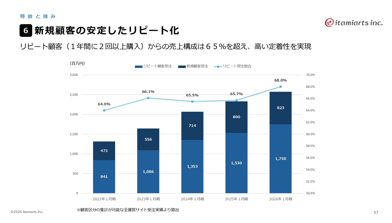 新規顧客に関しては、スライドの折れ線グラフがリピート率を示しています。2026年1月期には68パーセントという高いリピート率を記録しています。