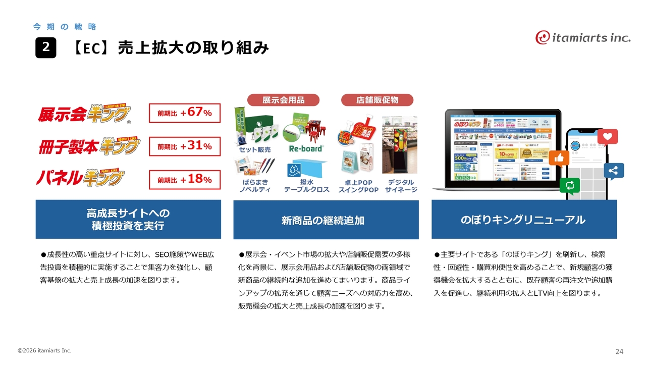 ECの売上拡大に向けた取り組みです。高成長を見せているサイト「展示会キング」「冊子製本キング」「パネルキング」に重点的に投資を行い、SEO施策やWeb広告の実施を進めていきます。