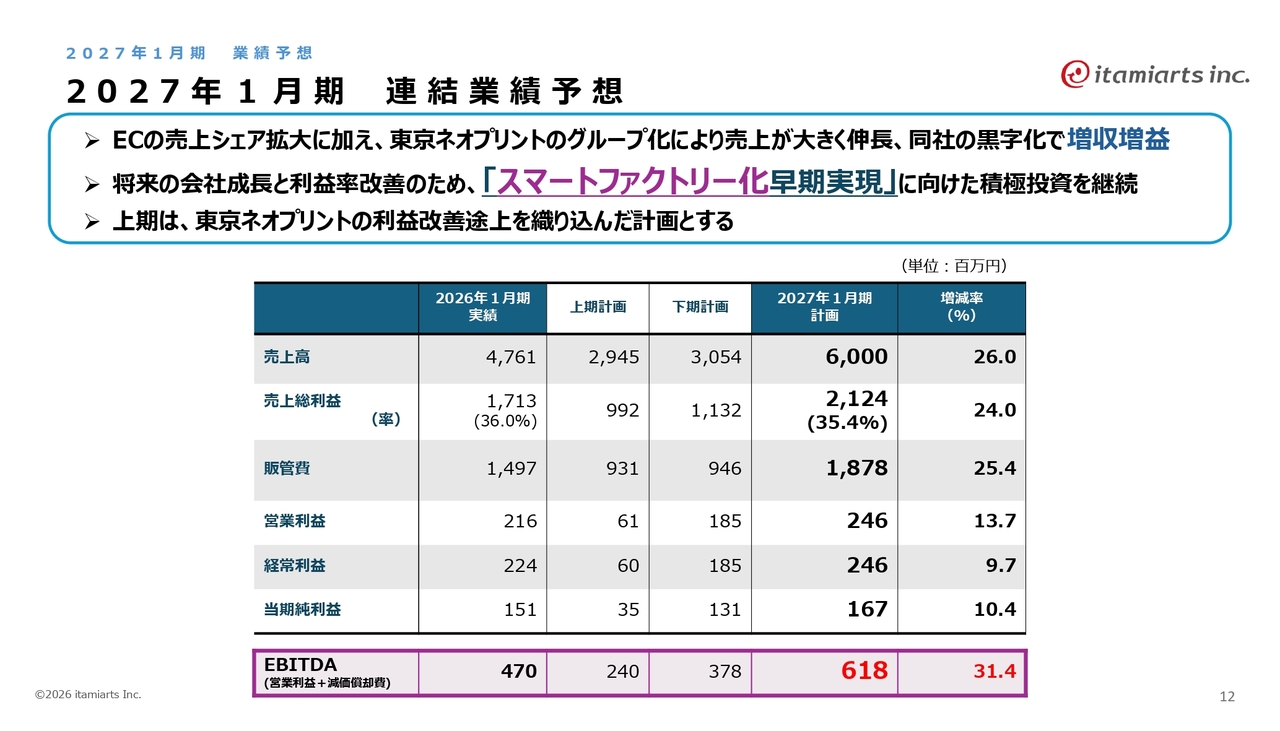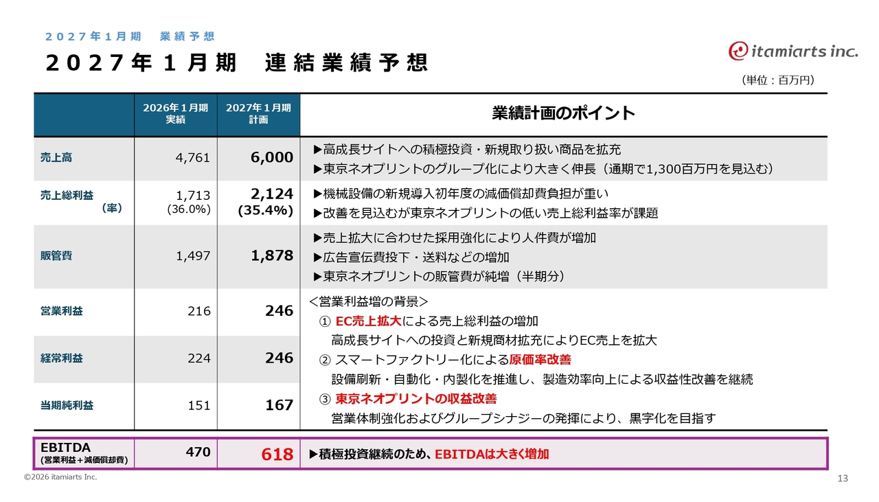 2027年1月期の業績予想です。EC売上の拡大に加え、東京ネオプリントのグループ化によって売上が大きく伸びる見込みです。スマートファクトリー化の早期実現を目指し、積極的な投資を進めていきます。