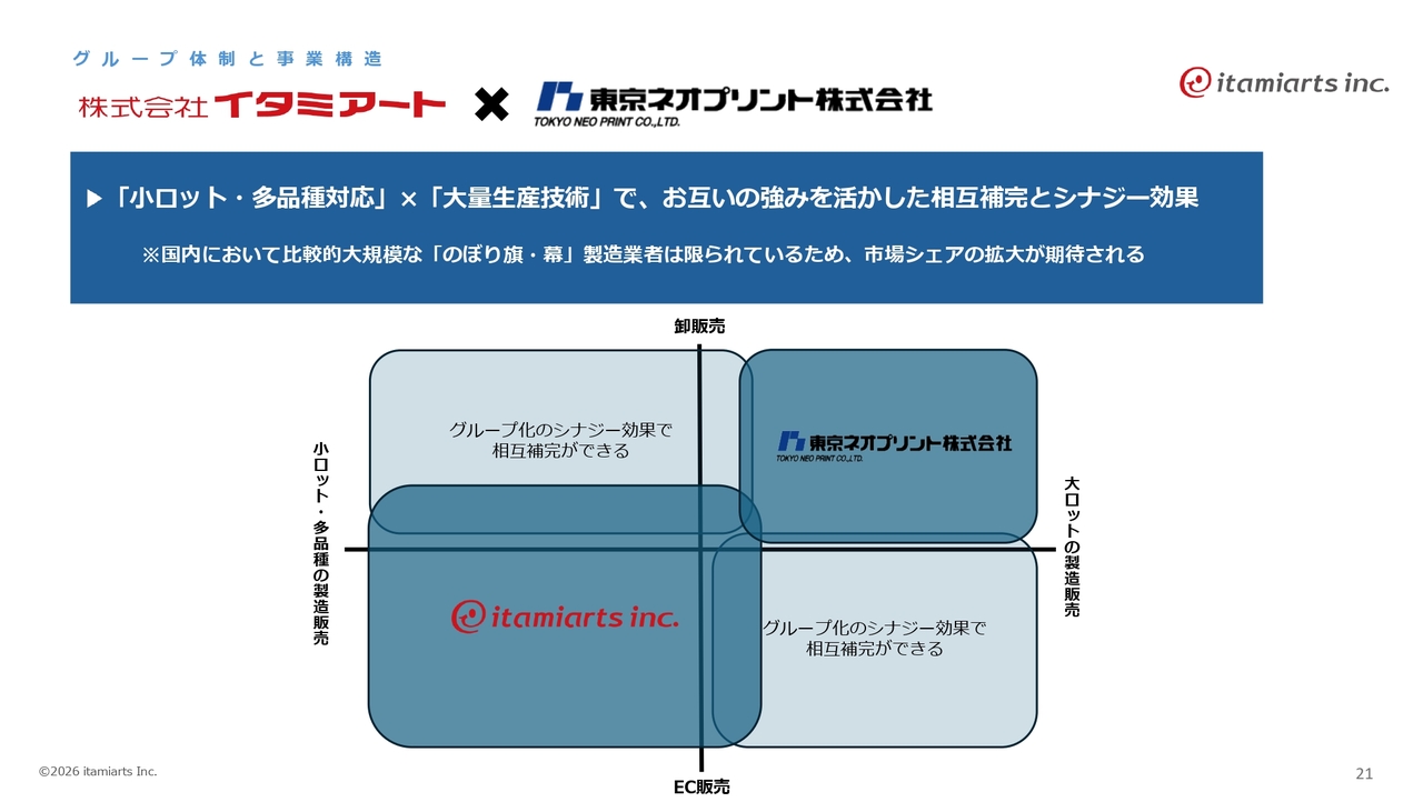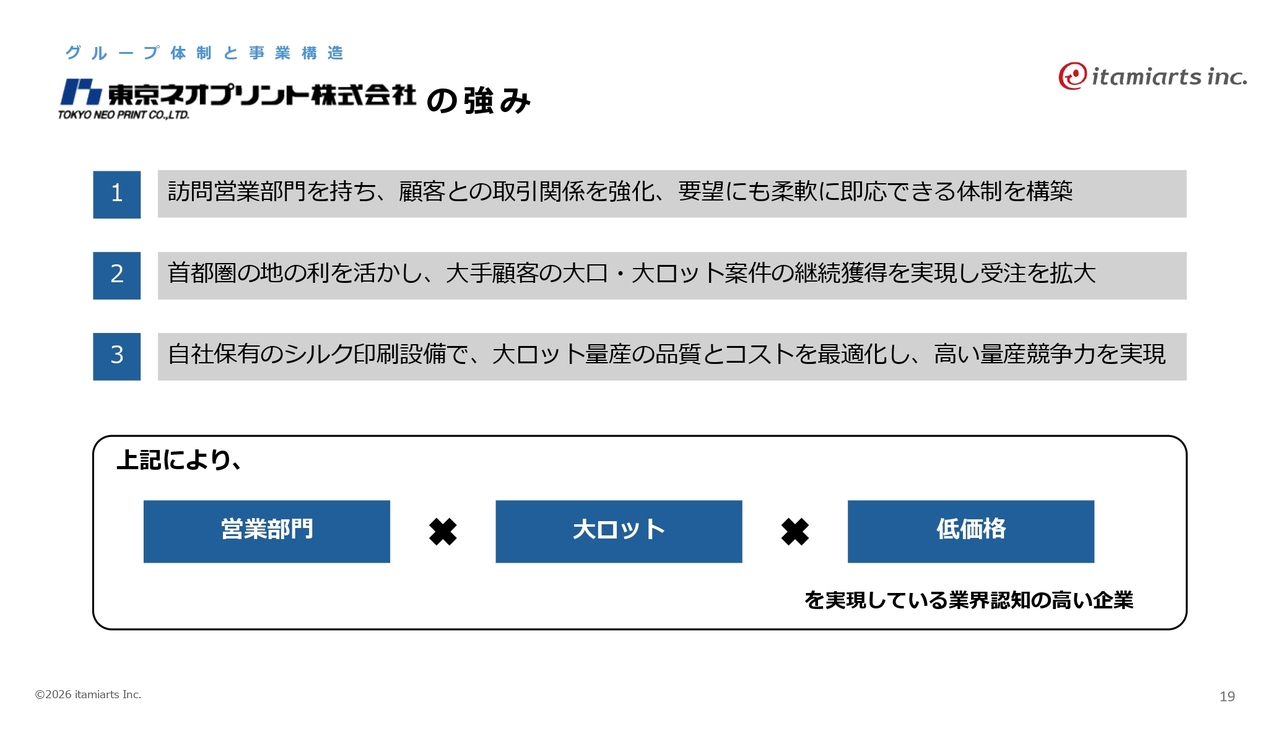 グループの体制として、イタミアートおよび東京ネオプリントのそれぞれのポートフォリオや位置づけは、スライド下部の表のとおりです。