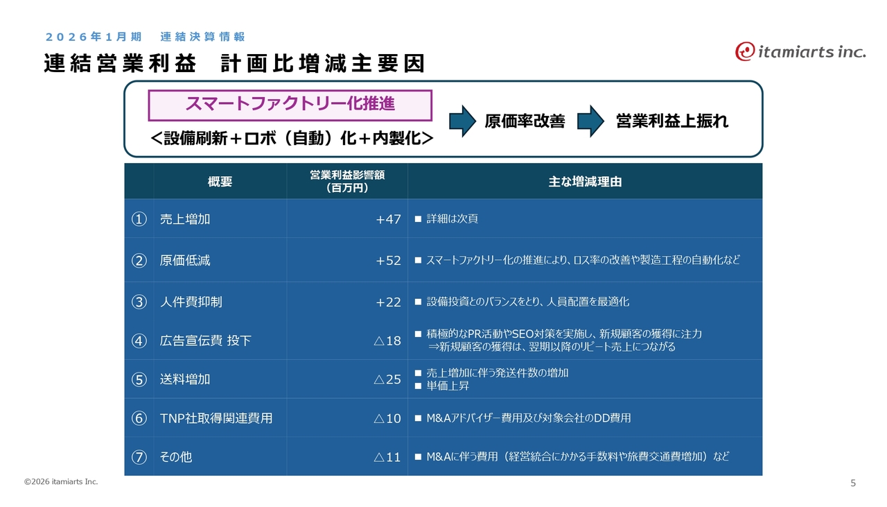 今回、営業利益が計画を上回った主な要因は、スマートファクトリー化の進展による製造効率の向上です。設備の刷新や工程の自動化、自動ロボットの導入などにより、ロス率が改善し、売上原価率が想定以上に低減しました。その結果、営業利益および経常利益は計画を上回る結果となりました。