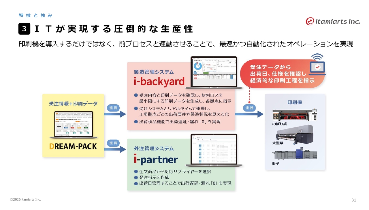 「DREAM-PACK」で受注したものを製造管理システム「i-backyard」を通じて、大型の印刷機にデータを流すことで、効率的な印刷を実現しています。