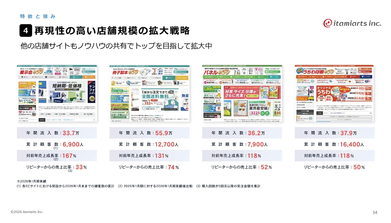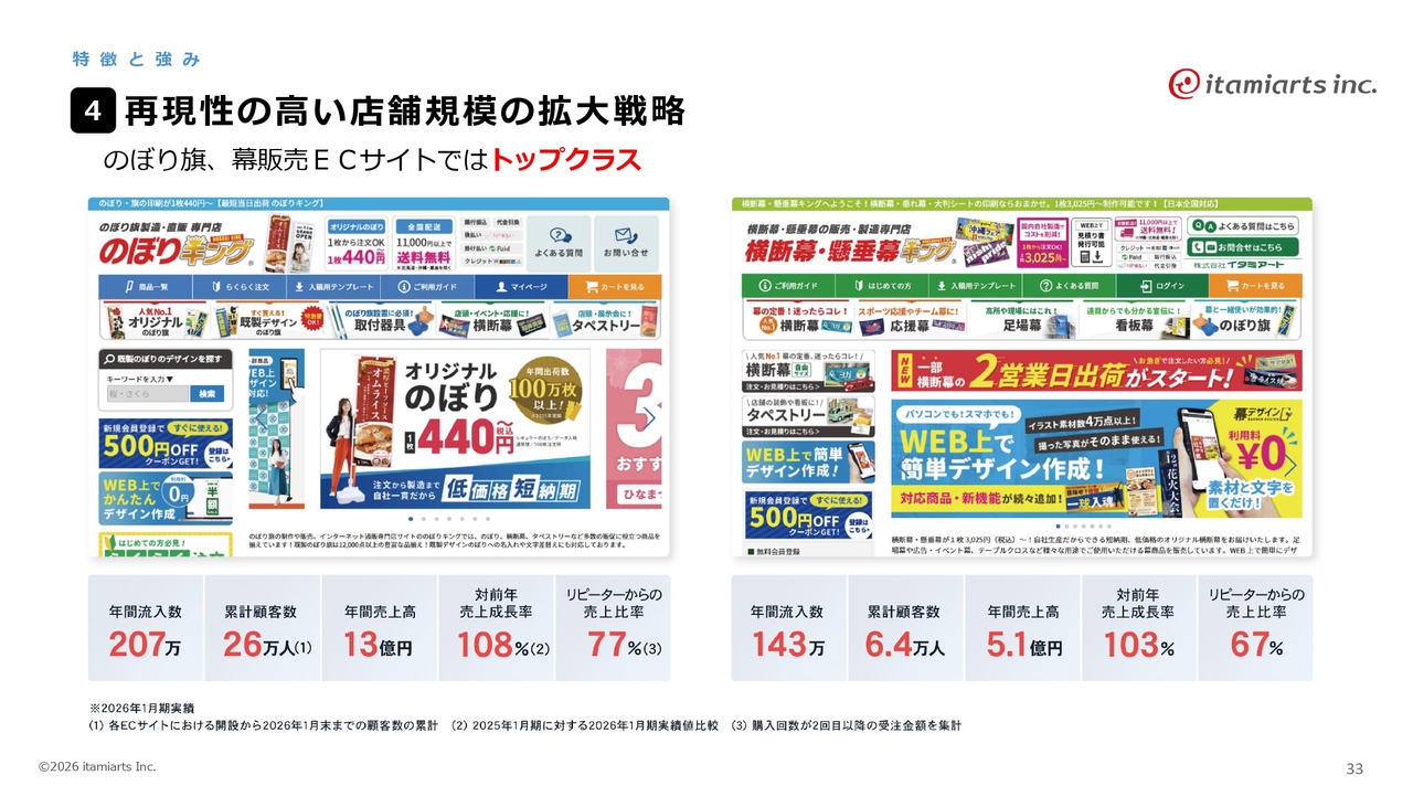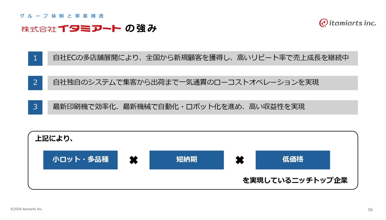 イタミアートの強みについてです。自社ECの多店舗展開により全国から新規顧客を獲得し、高いリピート率で売上成長を継続しています。自社独自のシステムにより、集客から出荷まで一気通貫のローコストオペレーションを実現しています。