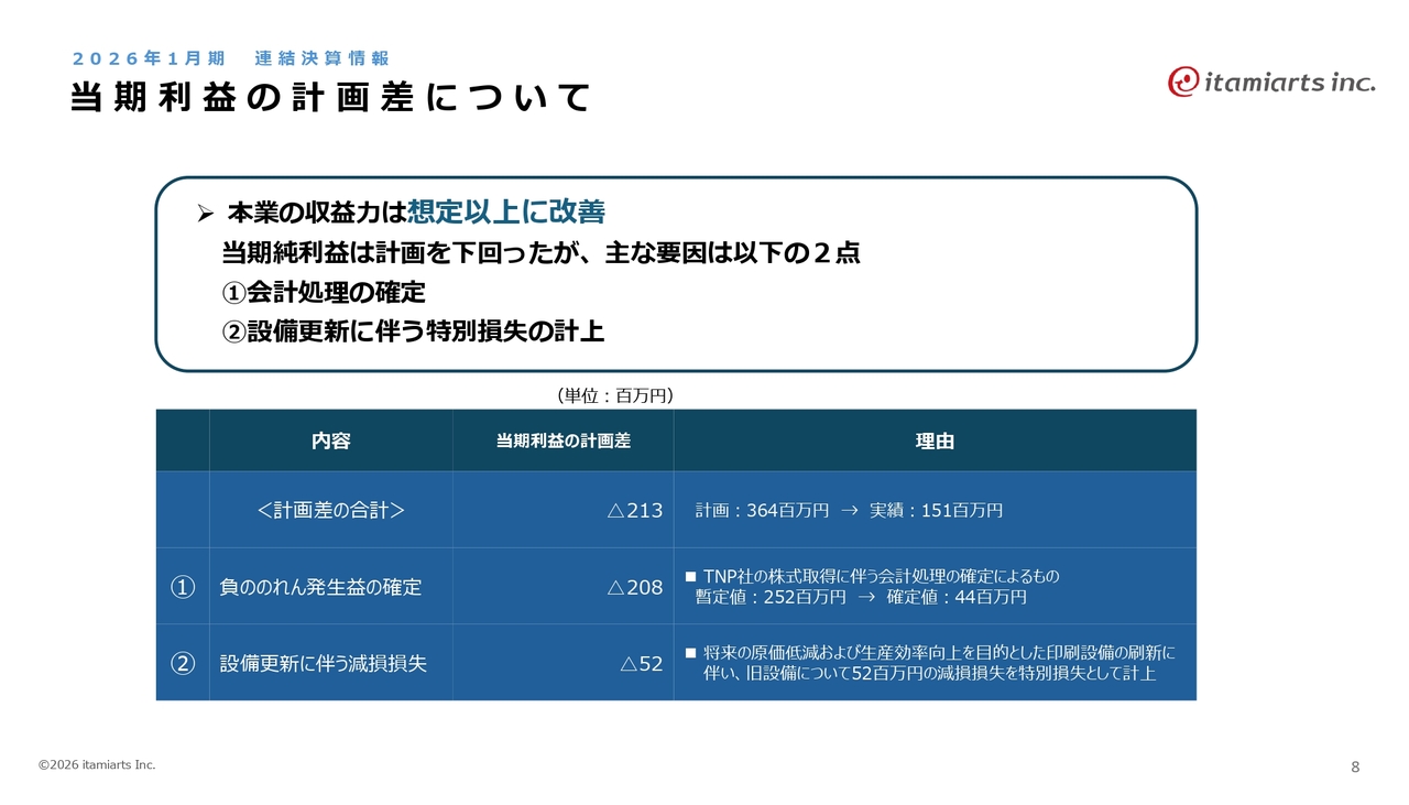 当期利益の計画差についてです。本業の収益力は想定以上に改善していますが、東京ネオプリントの株式取得に伴う会計処理の確定により計画に比べマイナスが生じています。また、新規設備に伴う減損が発生しており、こちらでも5,200万円の影響が出ています。