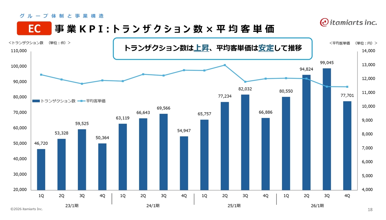 ECにおける事業KPIは「トランザクション数×平均客単価」です。平均客単価は比較的安定して推移し、トランザクション数は増加しています。