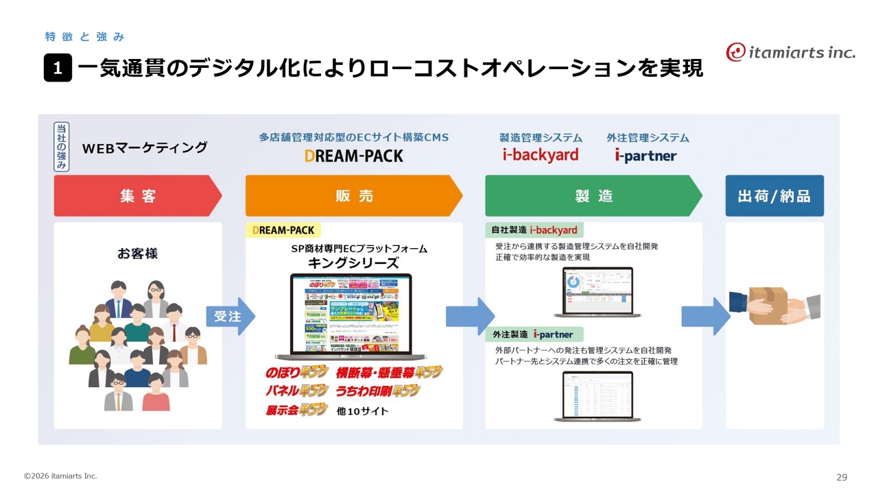 当社の特徴と強みについてご説明します。まず、Webマーケティングや販売、製造、出荷といった一気通貫のデジタル化を通じて、ローコストオペレーションを実現している点です。