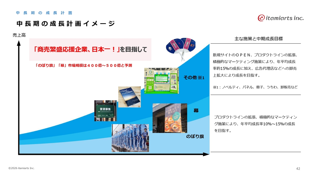 中長期の成長計画のイメージです。主力商品であるのぼり旗や幕は、年間10パーセントから15パーセントの成長を継続していきます。新サイトのオープンや広告代理店への卸売拡大により、さらなる成長を目指したいと考えています。