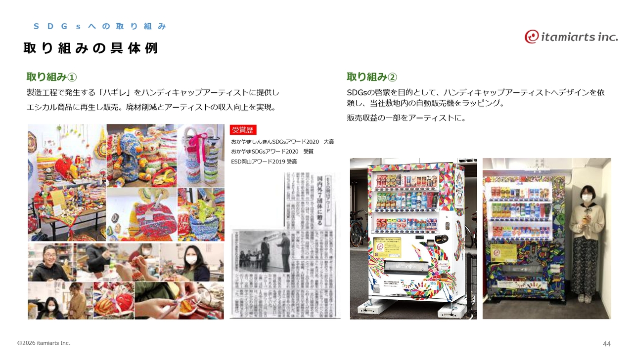 SDGsへの取り組みについてです。ハンディキャップアーティストの方々にハギレを利用していただき、スライドの画像のようなエシカル商品への再生をお願いすることで、アーティストの収入向上に貢献しています。