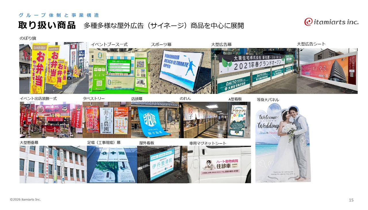 当社は、主力商品であるのぼり旗をはじめ、イベントブース一式、スポーツ幕、大型広告幕・広告シート、イベント出店装飾一式、タペストリー、店頭幕、のれん、A型看板、大型懸垂幕、工事現場の足場幕、屋外看板、車用マグネットシート、等身大パネルなどのサイネージ商品を中心に展開しています。