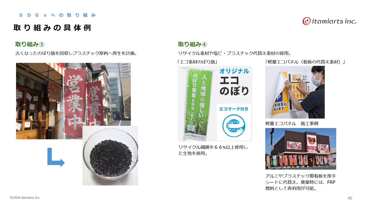 古くなったのぼり旗を回収し、スライドの画像のようなプラスチック原料に変換することで、今後ボイラーの燃料として自社で活用し、SDGsに取り組んでいきたいと考えています。