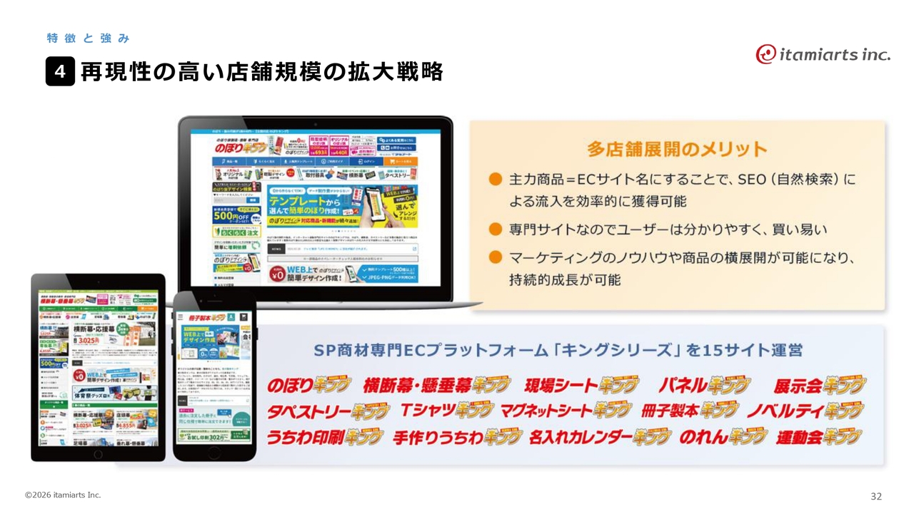 再現性の高い店舗として、「のぼりキング」をはじめ、「キングシリーズ」など16サイトを展開しています。当社の特徴として、商品名をECサイト名にすることで、ユーザーにとってわかりやすく、購入しやすいサイト作りを行っています。