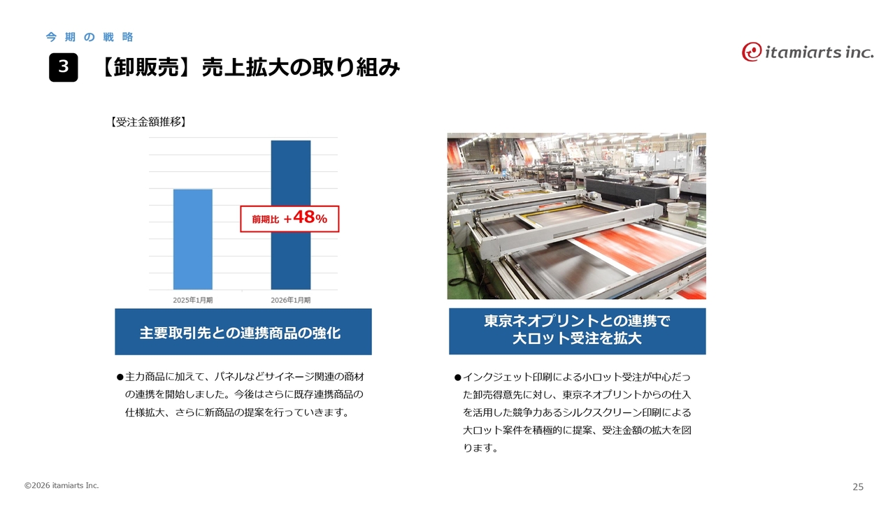 主要取引先との連携を強化し、これまでの主力商品に加えて、パネルやサイネージといった関連商品の取り扱いを開始しました。既存商品との連携を図ることで、売上の拡大に努めていきます。また、東京ネオプリントとの連携により、大ロットの受注を開始する予定です。
