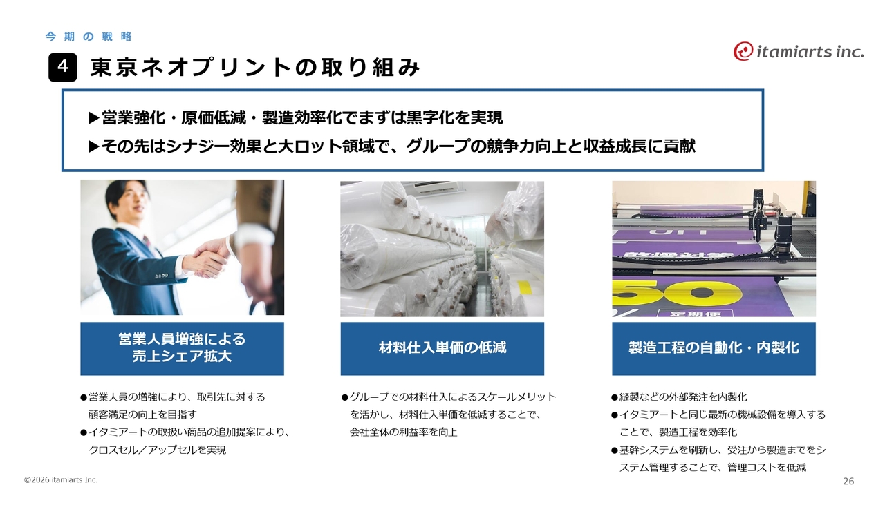 東京ネオプリントの取り組みとしては、営業力および営業人員を強化することで、売上シェアの拡大を進めていきます。材料仕入については、イタミアートとのグループ内での調達を行うことで、スケールメリットを活かし、コストを削減していきます。