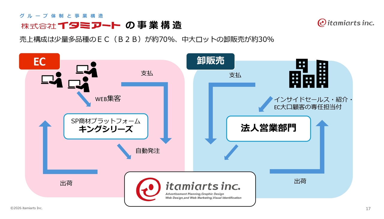 イタミアートの事業構造についてです。当社は、ECと卸売に分かれています。ECでの受注は全体の約70パーセント、中大ロットの卸売が約30パーセントを占めています。