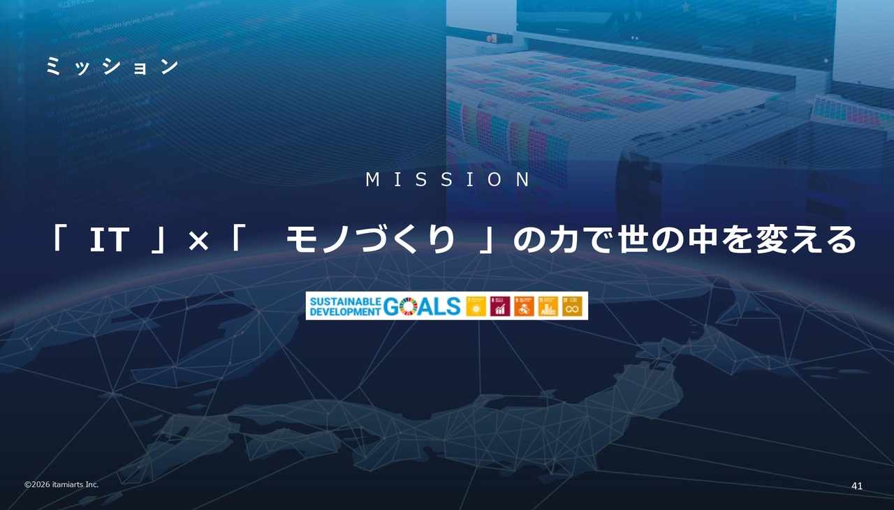 中長期計画についてご説明します。ミッションは「『IT』×『モノづくり』の力で世の中を変える」としています。