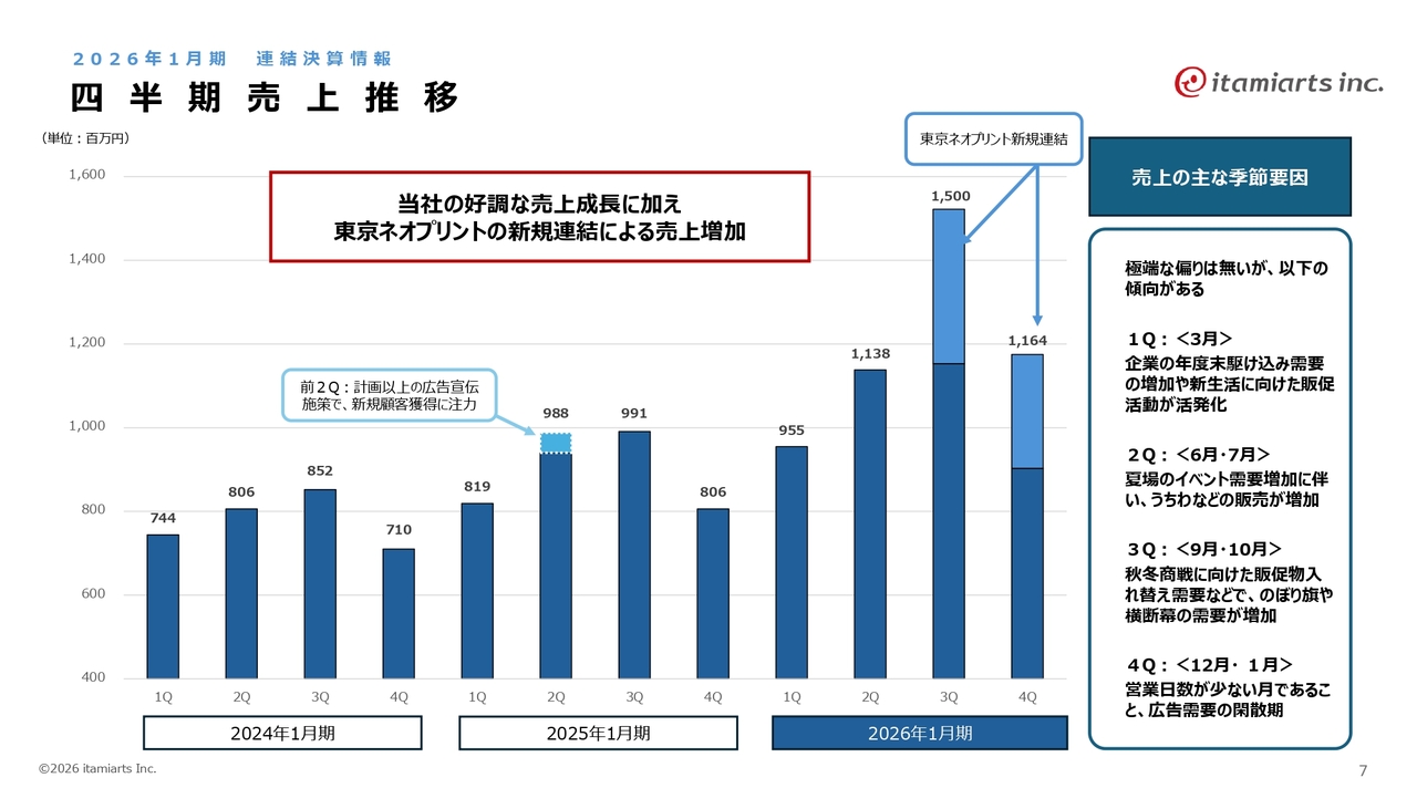 2026年1月期において、グラフの上部の薄い水色の部分が東京ネオプリントを新たに連結した部分の売上を示しています。濃い水色の部分はイタミアート単体での売上を表しています。2025年1月期と比較しても、単体の業績も順調に伸ばすことができています。