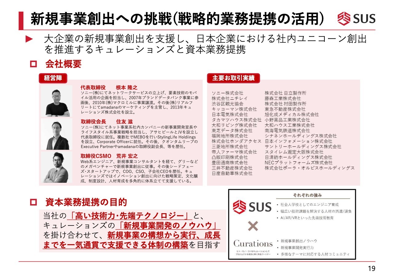 新規事業の2社目として、キュレーションズと資本業務提携を行いました。この会社は、大手企業から社内ユニコーンを創出するためのコンサルティングを手掛けており、日本ではトップクラスの顧客と取引実績のある会社です。