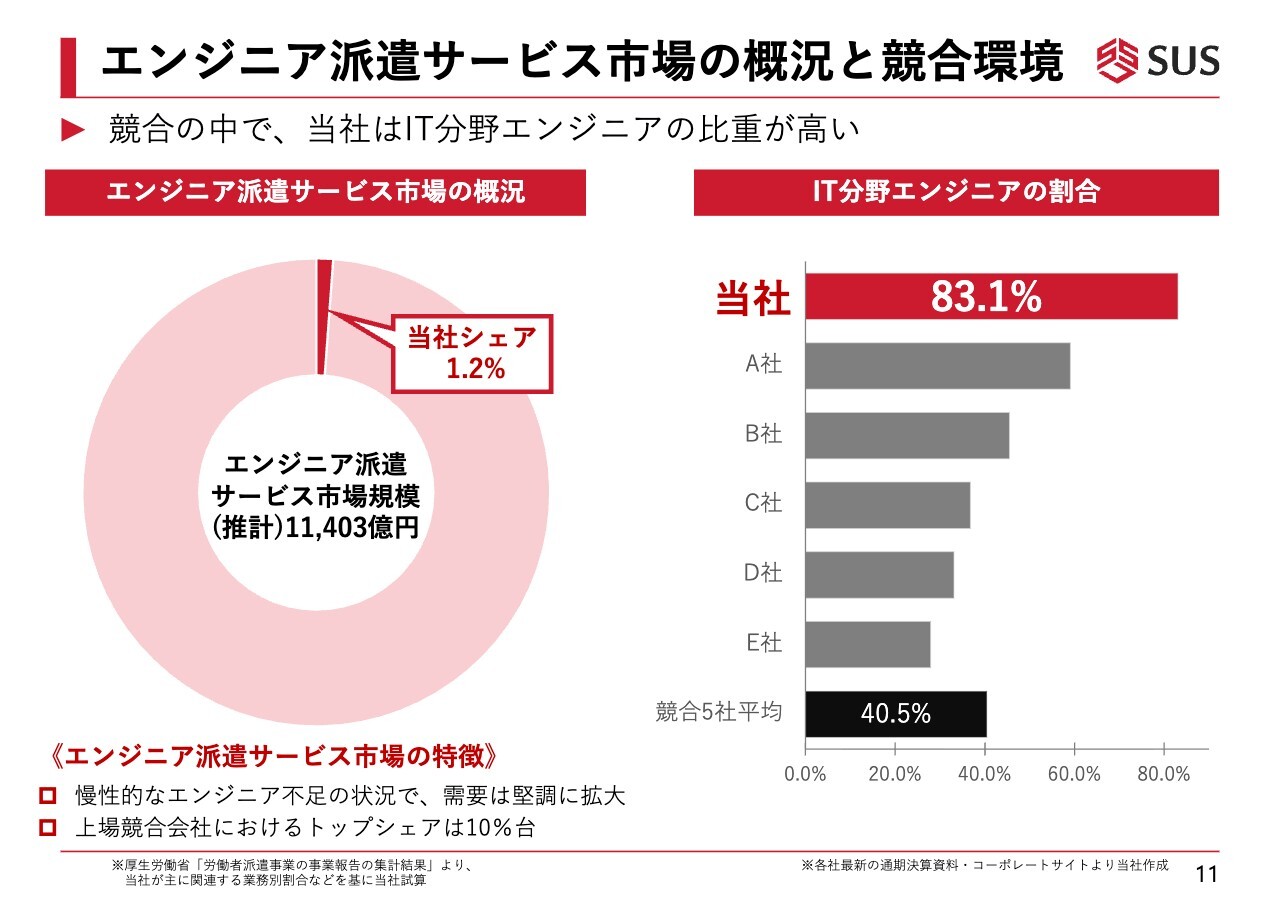エンジニア派遣サービスの市場規模は、全体で推計1兆1,000億円ほどです。上場している競合企業の中でシェアNo.1の企業でも、10パーセント台のシェアとなっています。当社は、そのトップの約10パーセントと比較すると、1割ほどに相当する1.2パーセントのシェアで展開しています。