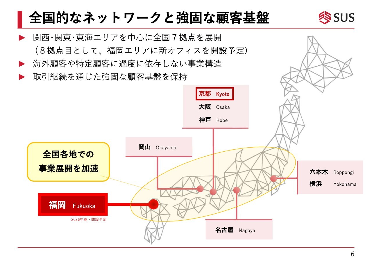 当社は全国的なネットワークと強固な顧客基盤を有しています。現在、スライドに掲載されている7拠点を基に展開しています。京都本社を軸に、大阪、神戸、名古屋、東京の六本木、横浜、岡山も含めて展開してきました。