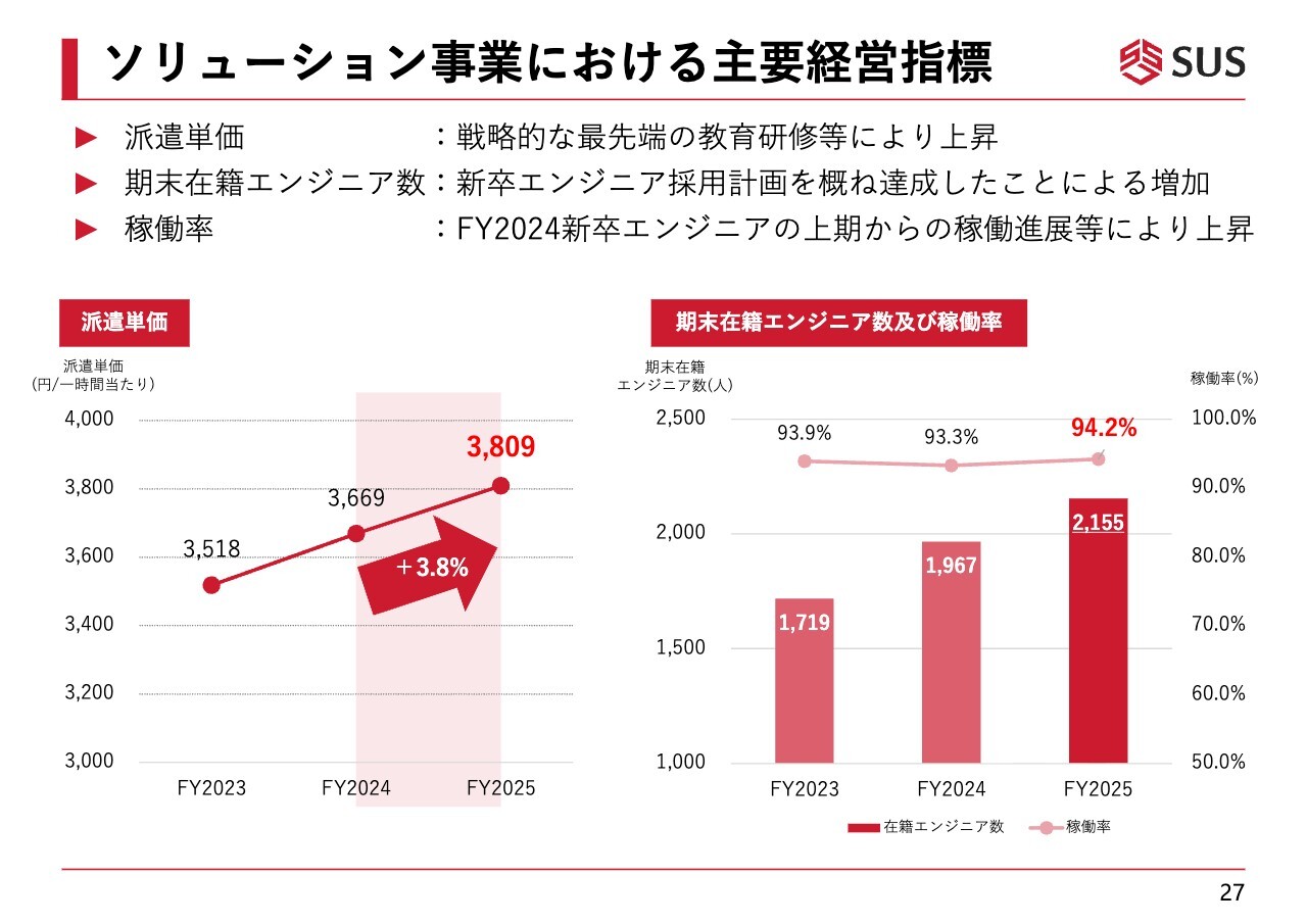 この3つの主要なKPIについて、順にご説明します。まず、派遣単価についてですが、これはスライド左側のグラフに示されています。派遣単価は年々上昇しており、2024年9月期比で3.8パーセント上昇しました。