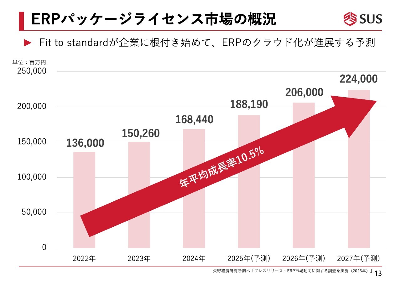 スライドの予測では、年平均成長率10.5パーセントの割合でERPパッケージライセンス市場が成長していく状況が示されています。当社のコンサルティング事業部でも、このような成長マーケットをしっかりと捉え、引き続き攻めの展開を図っていきたいと考えています。