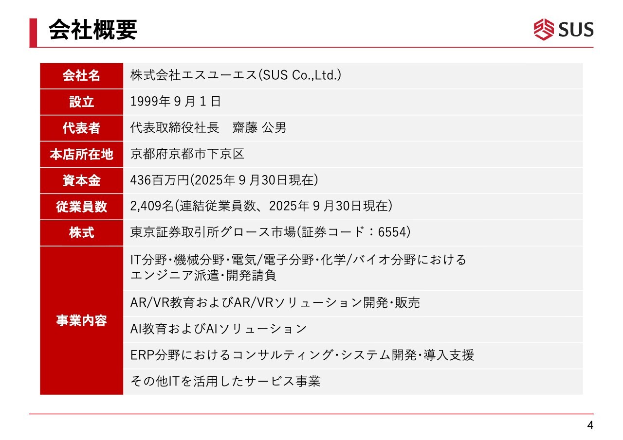 齋藤公男氏(以下、齋藤):代表取締役社長の齋藤です。本日はお忙しい中、集まっていただき、誠にありがとうございます。本説明会では、スライドを4つのパートに分けてお話しします。