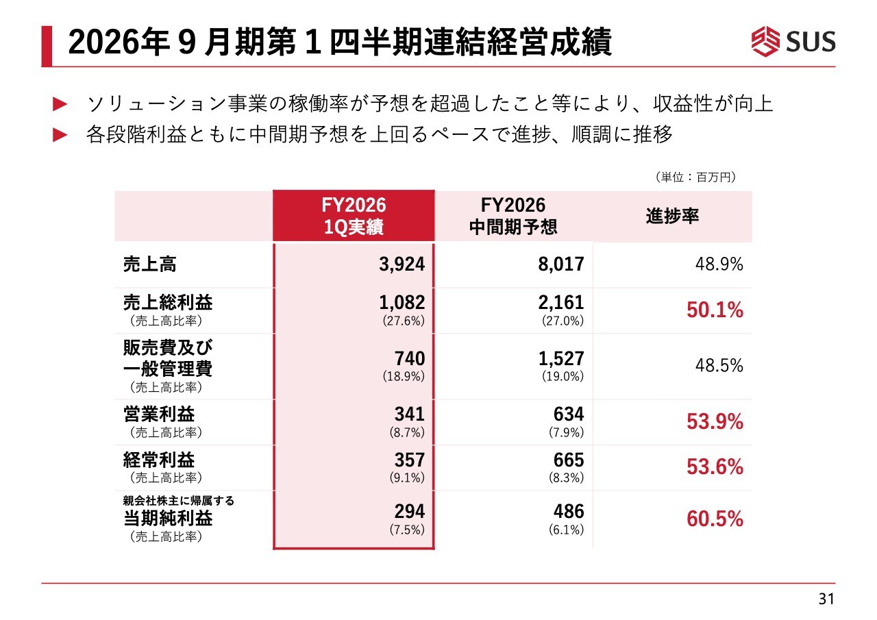 2026年9月期第1四半期の連結経営成績です。こちらはすでに発表済みですが、この中間期予想に対する進捗率は、各段階利益においておおむね半分に達しており、第2四半期も引き続き中間期予想に向けて順調に進捗していると考えています。