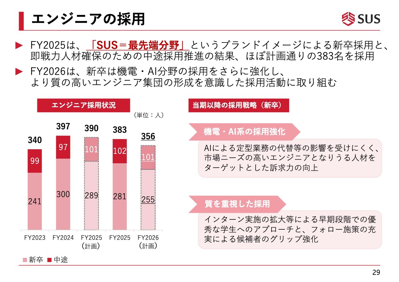 在籍エンジニアの増加を支える重要な要素である、エンジニアの採用についてです。前期は「SUS=最先端分野」というブランドイメージを前面に打ち出し、新卒採用と即戦力人材確保のための中途採用を推進し、ほぼ計画どおりの383名を採用しました。