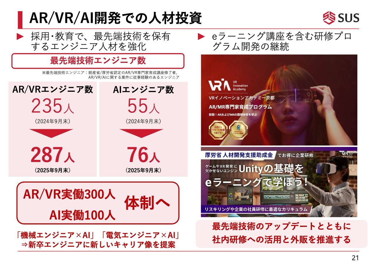 AR/VR/AI人材への投資について、具体的な数字をお伝えします。2025年9月末時点で、AR/VRエンジニア数が287名、AIエンジニア数が76名となっています。今年4月からも新たなエンジニアに教育を実施し、AR/VRの稼働人員を300名、AIの稼働人員を100名とする体制に向けて着実に準備を進めています。