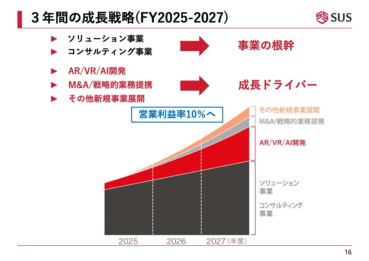 2025年9月期から3年間の成長戦略についてです。2027年9月期に向けて取り組みを継続しており、事業の根幹となるのはソリューション事業およびコンサルティング事業です。