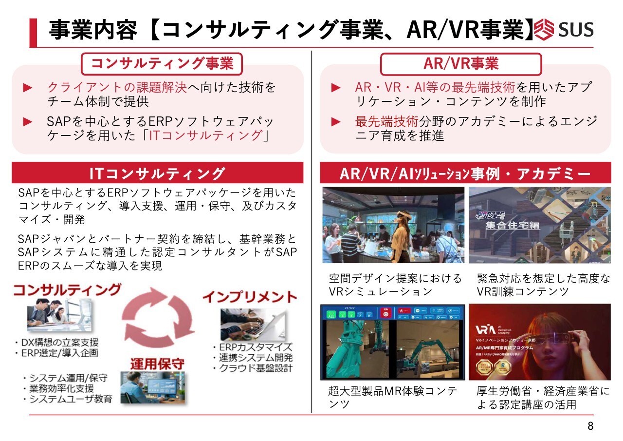 コンサルティング事業では、SAPを中心としたERPソフトウェアパッケージの導入支援を主な業務として取り組んでいます。また、AR/VR事業は最先端技術を用いた分野であり、エンジニア育成のためのアカデミーも運営しています。
