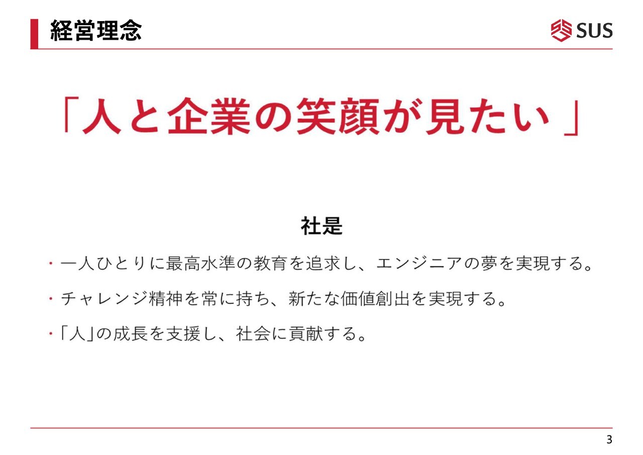 次に、社是を1つずつご紹介します。1つ目は「一人ひとりに最高水準の教育を追求し、エンジニアの夢を実現する」です。2つ目が「チャレンジ精神を常に持ち、新たな価値創出を実現する」です。3つ目が「『人』の成長を支援し、社会に貢献する」です。このような社是を掲げ、取り組んでいます。