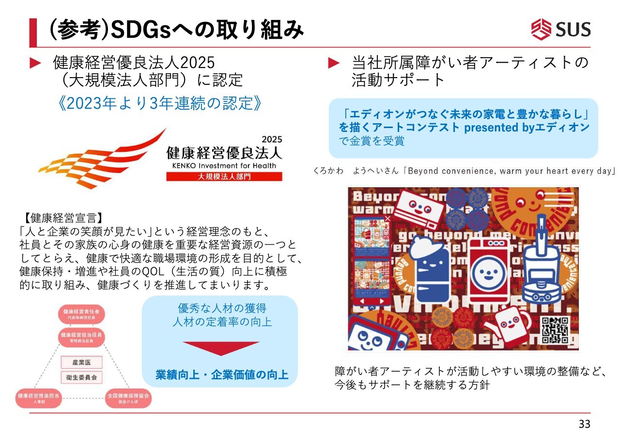 このような施策を通じ、さらに従業員の健康に注力し、優秀な人材の獲得や人材定着率の向上を実現することで、業績向上や企業価値向上につなげていきたいと考えています。