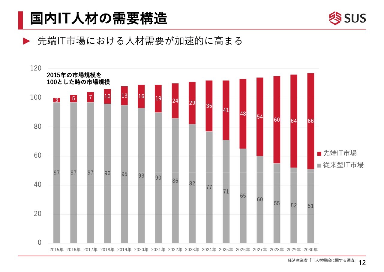 国内のIT人材の需要構造についてです。スライドにあるとおり、マーケット全体としては大きく伸びるというよりは、横ばい、もしくはわずかに増加している状況です。しかし、マーケットの中の割合では、グラフの赤い部分で示される先端IT分野へのニーズが毎年増加しています。