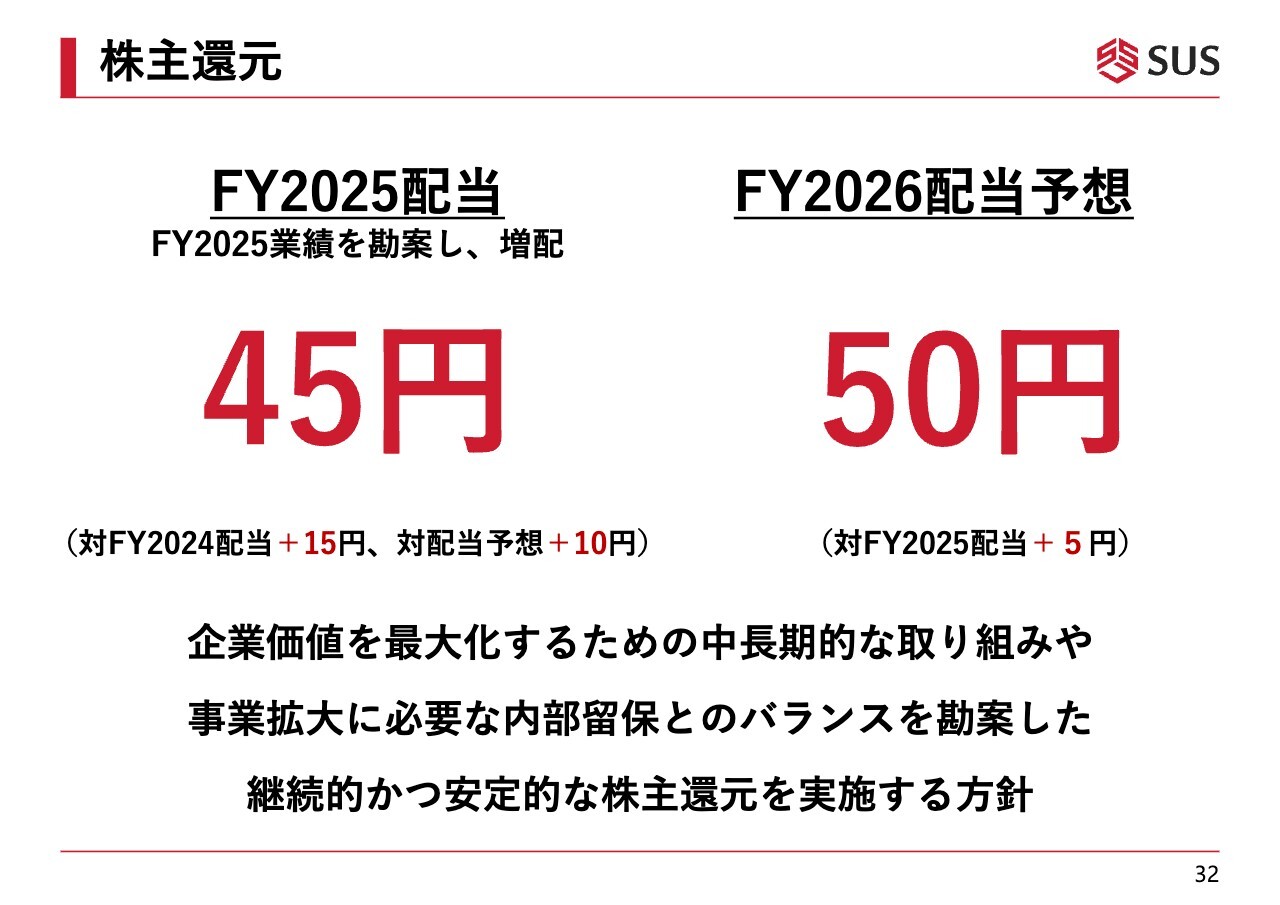 株主還元の方針については、スライドに記載のとおり、企業価値を最大化するために、中長期的な取り組みや事業拡大に必要な内部留保とのバランスを考慮し、継続的かつ安定的な株主還元を実施する方針です。事業の状況に応じて増配を目指し、年々なるべく配当を増やせるよう努めていきたいと考えています。