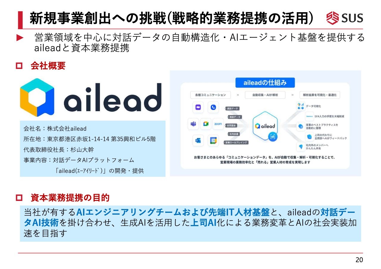 新規事業の3社目についてです。「ailead(エーアイリード)」と資本業務提携を行いました。同社は、営業領域を中心に対話データの自動構造化・AIエージェント基盤を提供している、スタートアップです。