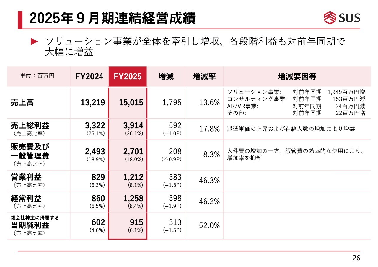 スライドは前期の連結経営成績を示しています。売上高は先ほどお話ししたとおり約150億円で、2024年9月期に比べて17億9,500万円増加しました。増加率は13.6パーセントです。4つのセグメントの中で、中核事業であるソリューション事業が特に大きく牽引しました。