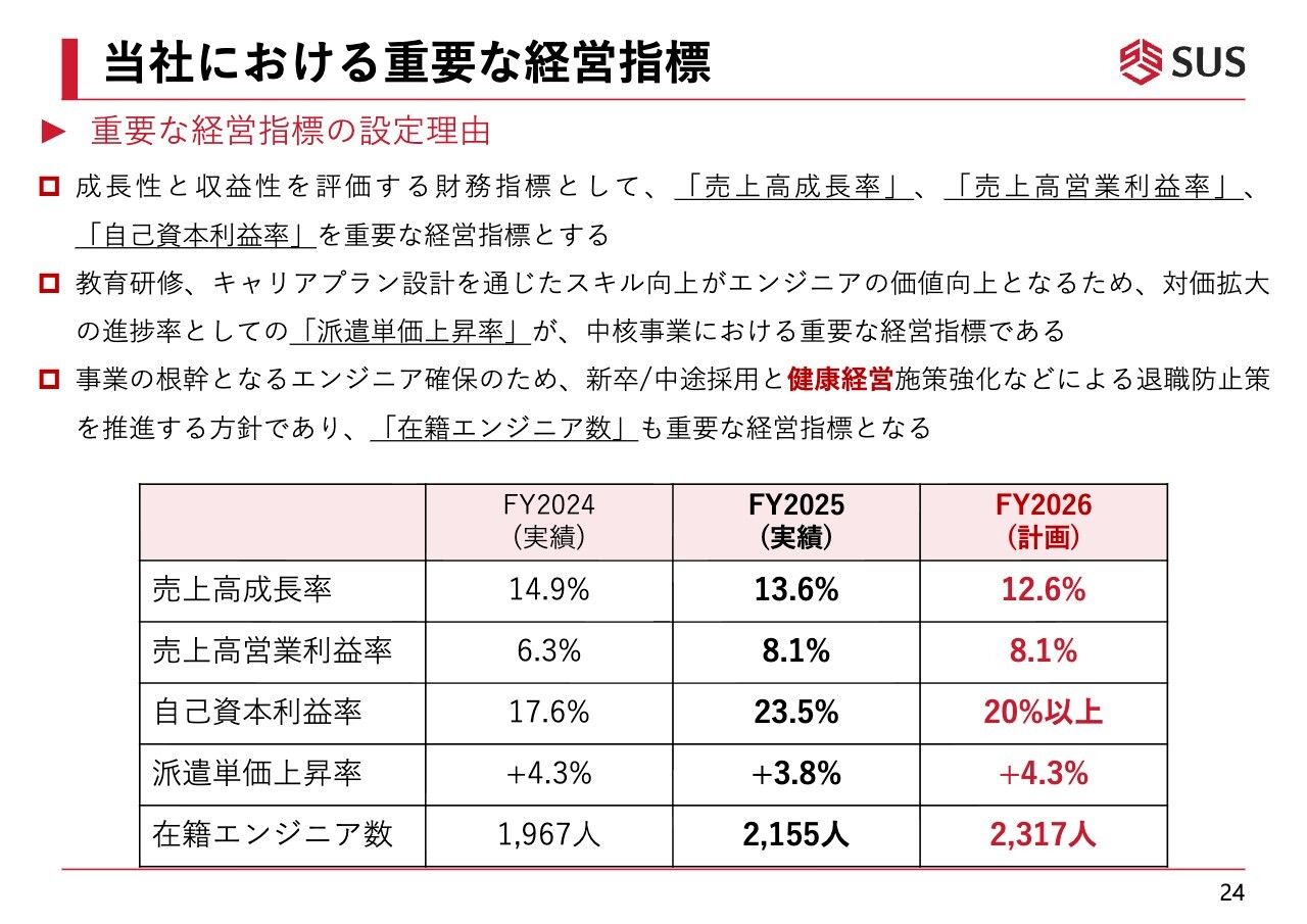 売上高営業利益率については、先ほど齋藤からの説明にあったとおり、2027年9月期の目標である10パーセント台を目指し、直近まで推移しています。自己資本利益率は、20パーセント以上を今期の目標としています。派遣単価上昇率は、プラス4.3パーセントを今期の目標としています。