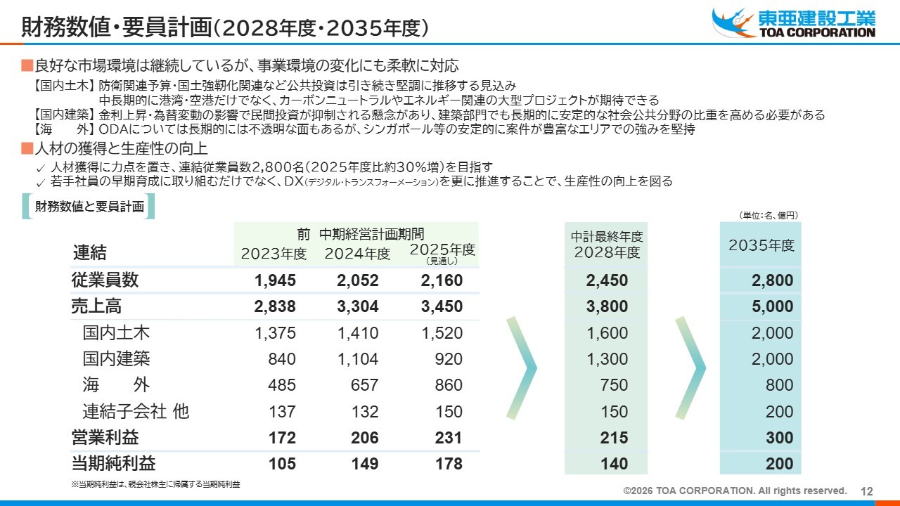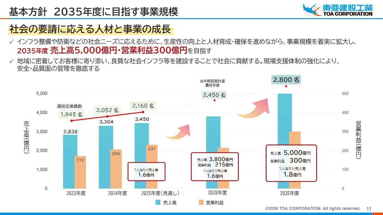 次期中期経営計画では、2035年度、すなわち10年後に目指すべき姿を想定しています。インフラ整備や防衛などの社会ニーズが旺盛な状況下で、生産性向上だけでなく、人員の増強と育成を進め、従業員数を2,800名に増やします。