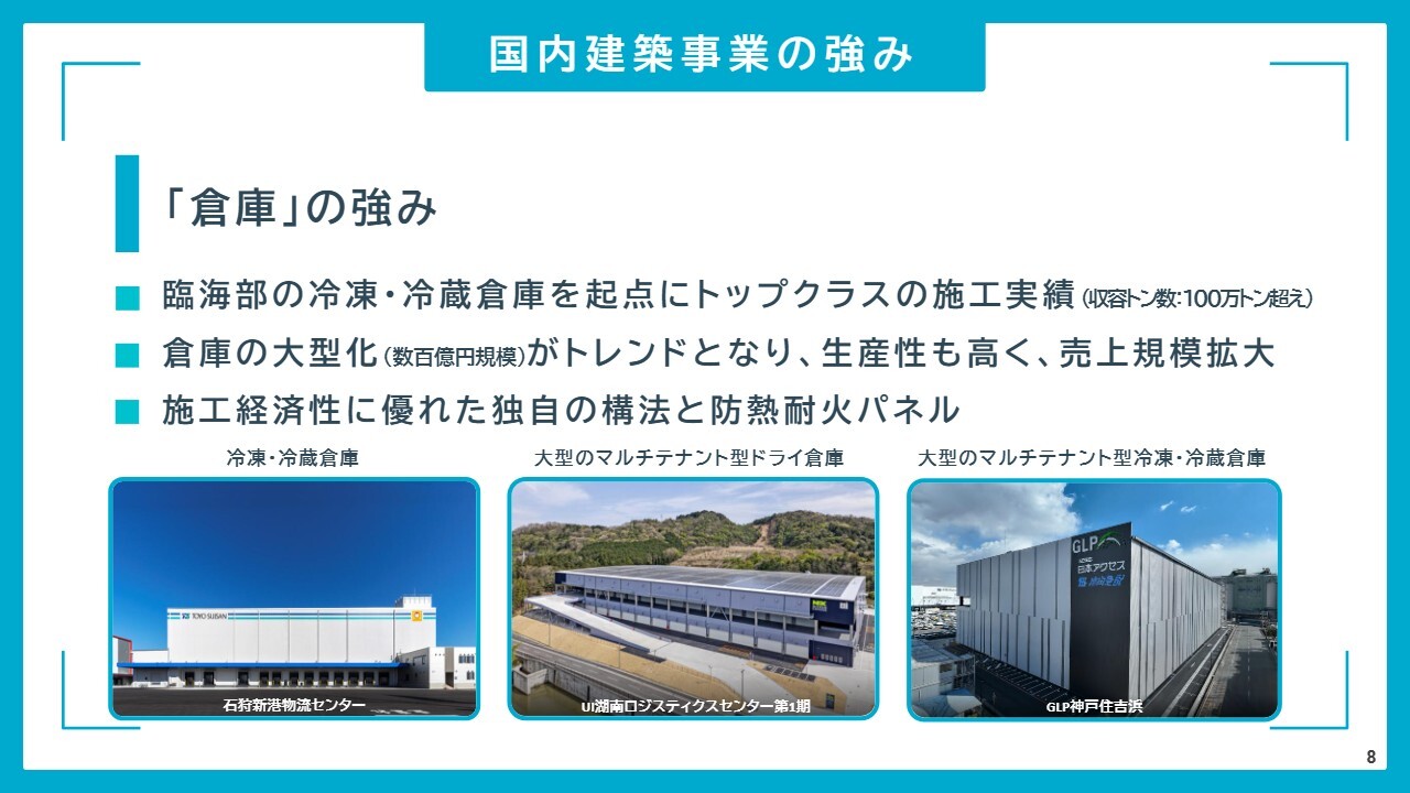 木村:国内建築事業の強みについてご説明します。当社はもともと臨海部からスタートした会社であり、建築事業も臨海部から始めました。当初は臨海部の冷凍・冷蔵倉庫を起点に実績を積み上げ、特に冷蔵倉庫はトップクラスの施工実績を持っています。