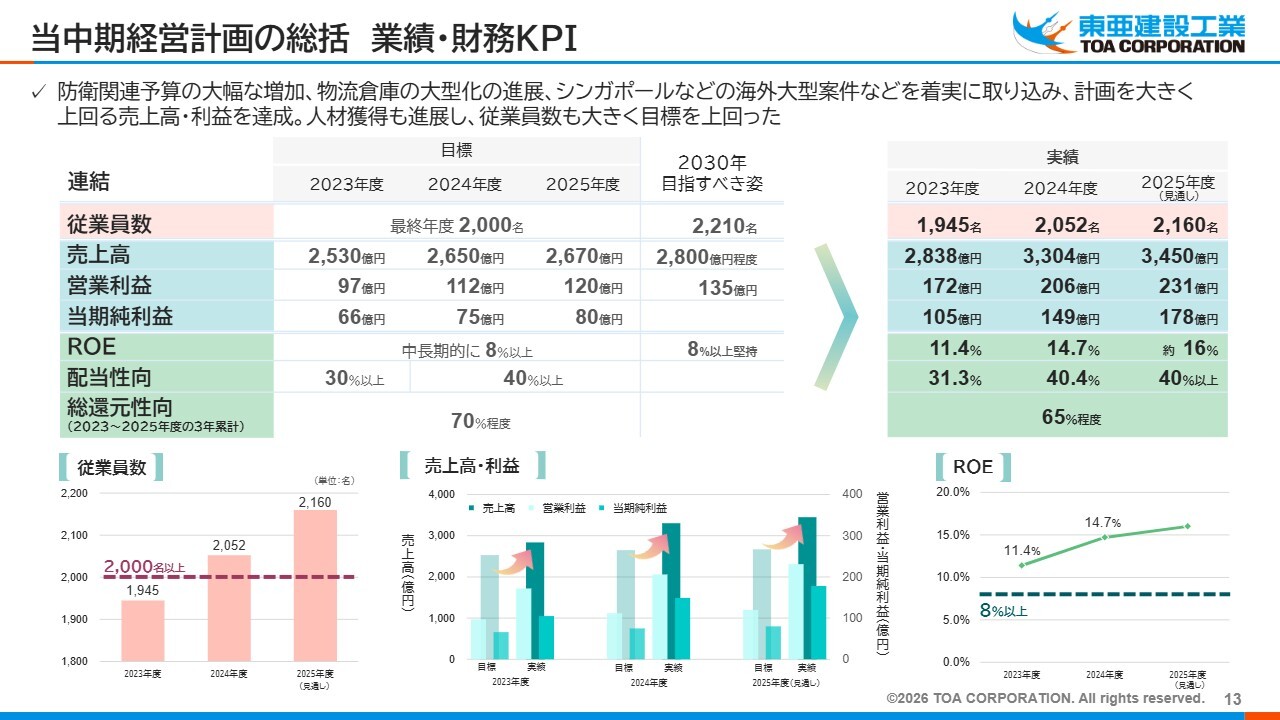 木村:2023年度から2025年度までの現中期経営計画の総括です。当初、連結従業員数の目標として、2025年度に2,000名を設定していました。採用を拡大した結果、スライド右側の実績に示しているとおり、現在の連結従業員数は2,160名となる見込みです。