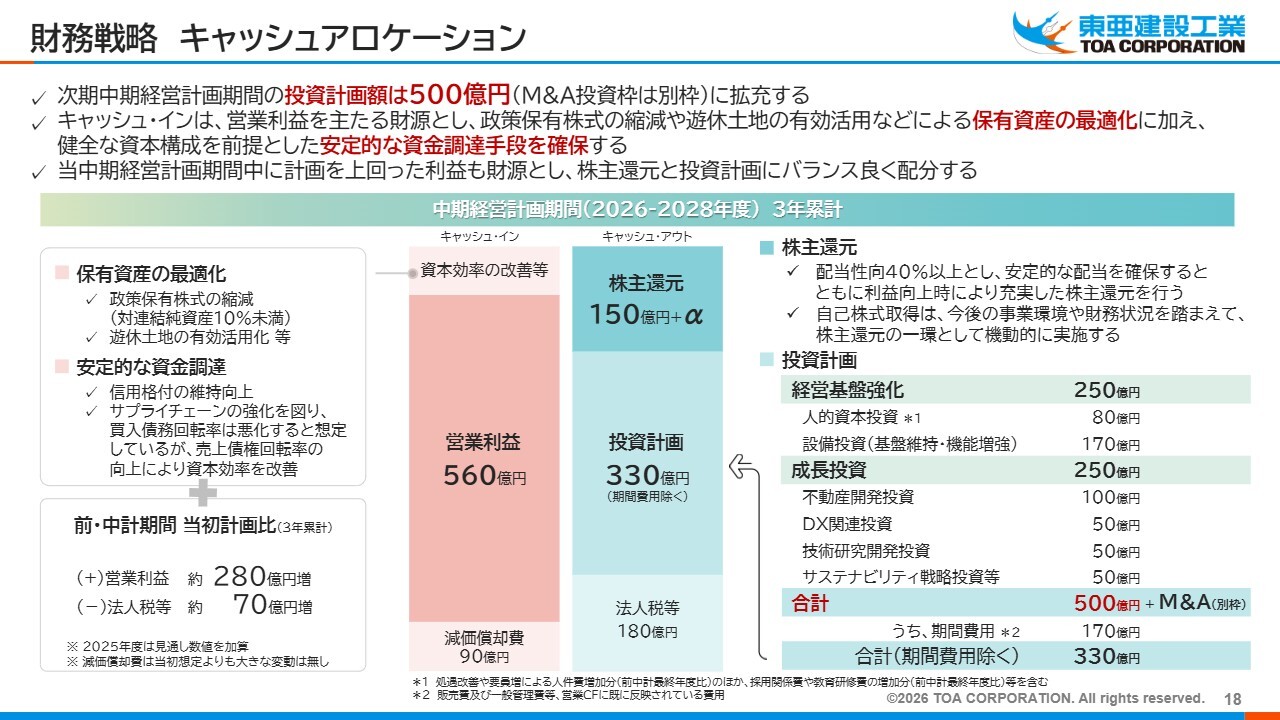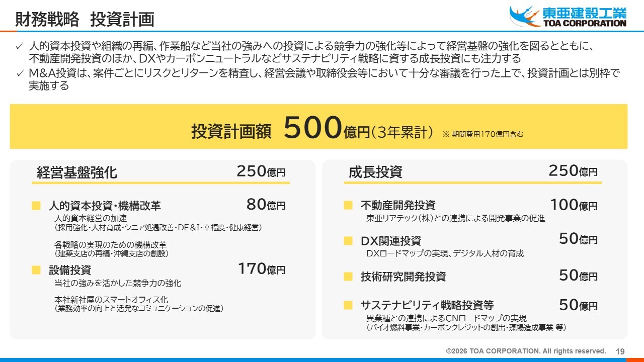 また、当社の強みを活かすため、作業船などの設備投資を今後少しずつ増やしていくことに加え、本社新社屋への移転によるスマートオフィス化で170億円を予定しています。これにより、経営基盤の強化で250億円を見込んでいます。