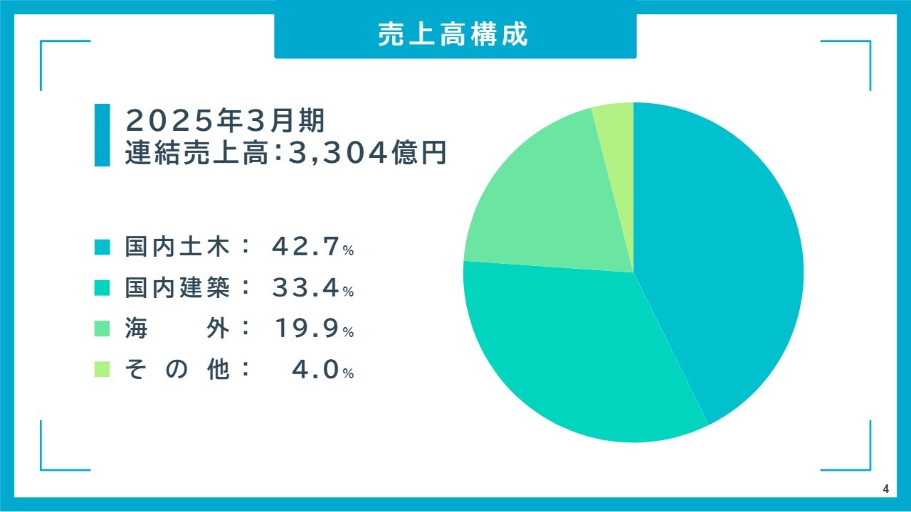 木村:売上高は、国内土木事業が約4割、国内建築事業が約3割、海外事業が約2割という構成です。前期末の売上高は3,304億円でした。