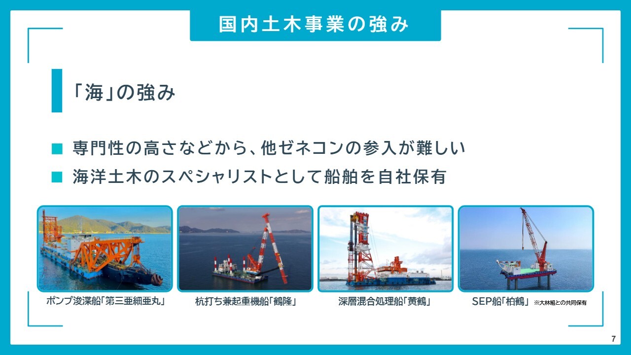 木村:各セグメントの強みについてご説明します。国内土木事業は、とりわけ「海」において強みを持っています。特に専門性の高さを武器としており、スライドの写真にあるような大型の作業船を自社で保有し、特殊な海において強みを発揮しています。
