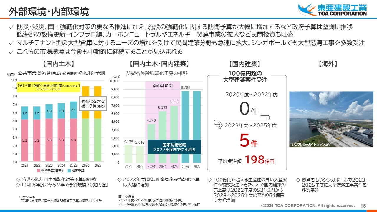 このように、国内土木事業は防衛関連に限らず、空港や交通インフラ整備といった分野でも大きく貢献していくと考えています。