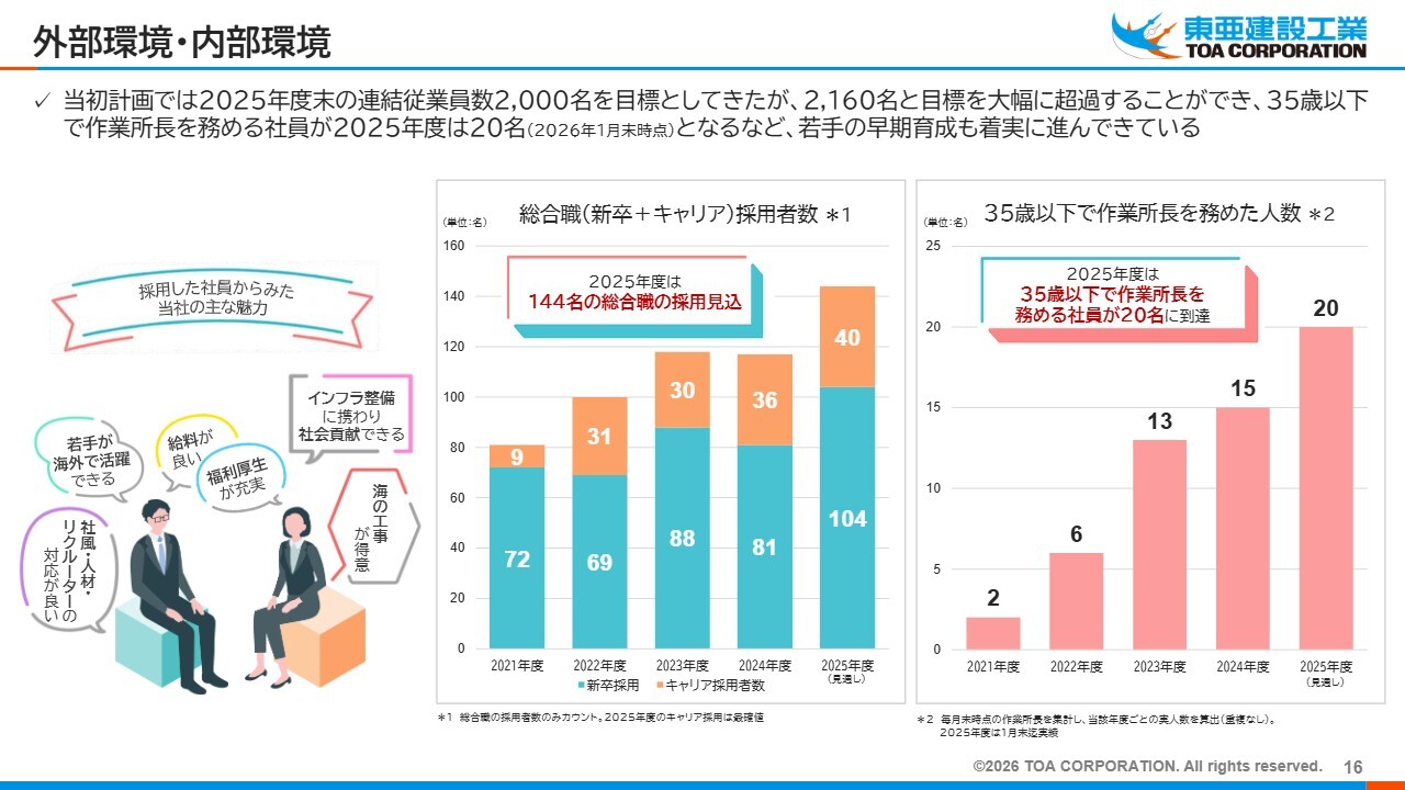 木村:外部環境・内部環境についてです。先ほどからお伝えしているとおり、人材は非常に重要な要素だと考えています。採用者数は大きく伸びており、今年度の見通しでは総合職を144名採用する見込みです。