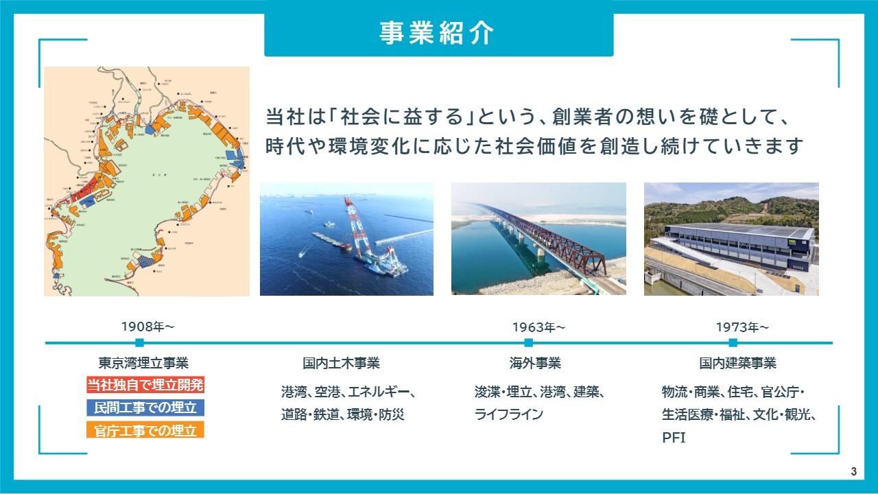 木村:動画でも説明がありましたが、当社は東京湾の埋立事業から始まりました。主に土木関係の埋立開発を中心とし、その後、国内の土木関連事業として港湾や空港といった分野を軸に発展してきました。