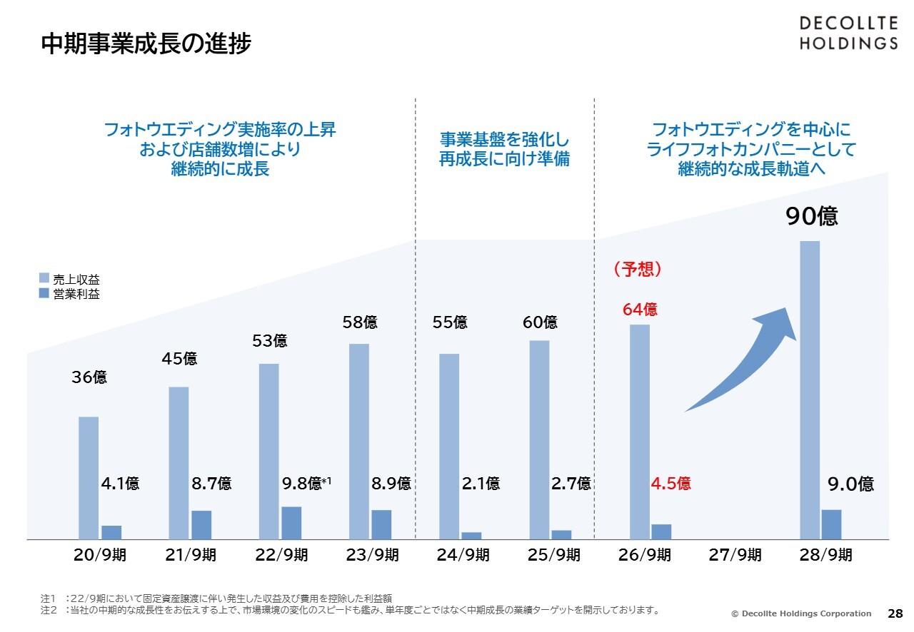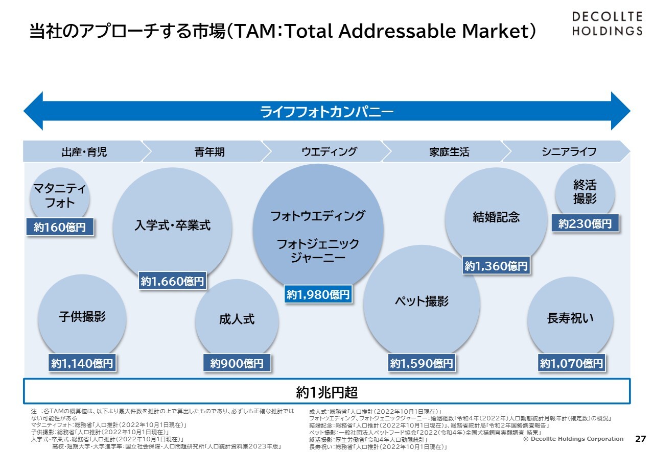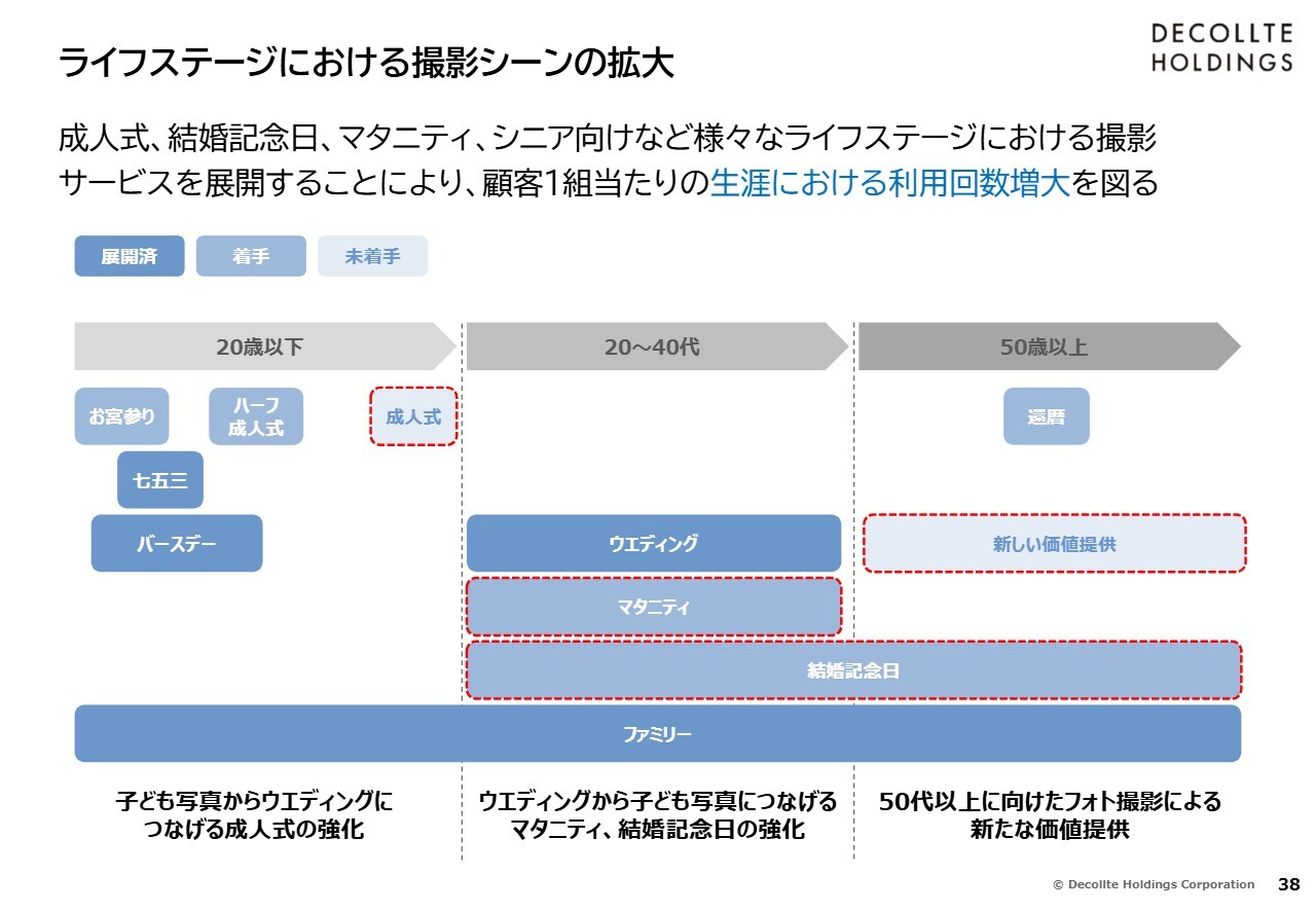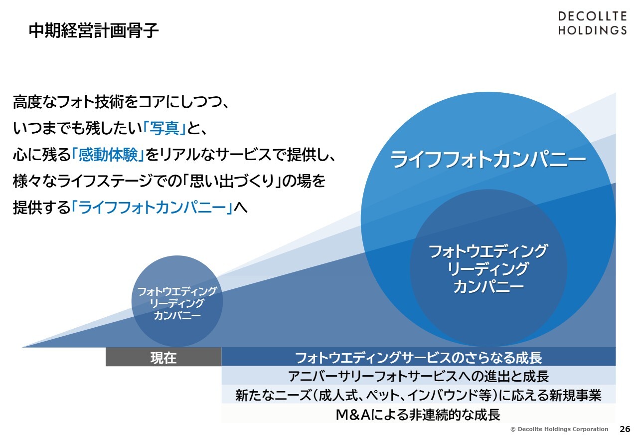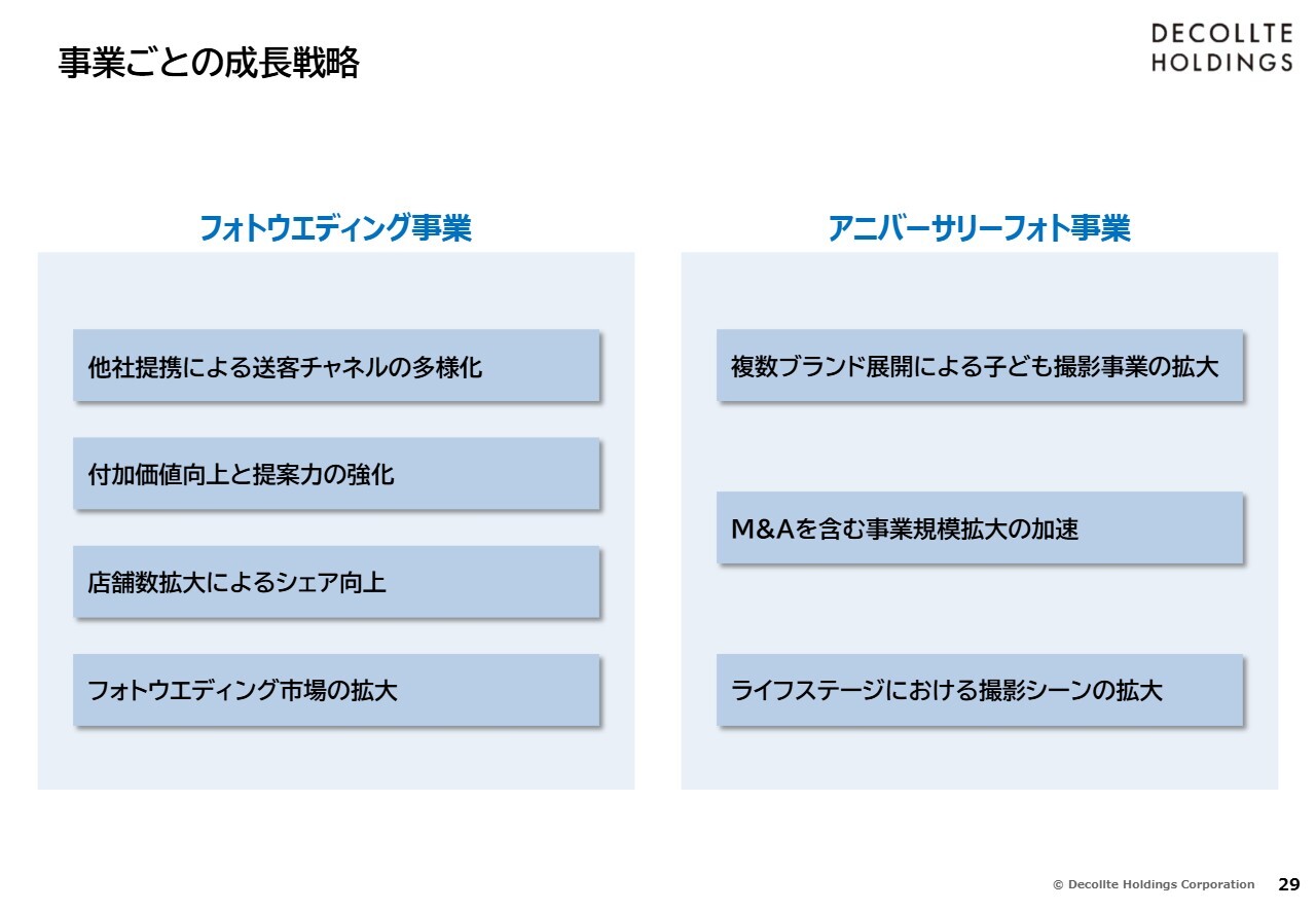 その上で、スライドに示したように、アニバーサリーフォトを含めた、さまざまなジャンルの写真に間口を広げます。お客さまの生涯にわたり写真を撮影させていただくことで、さらなる成長を目指していきたいと考えています。