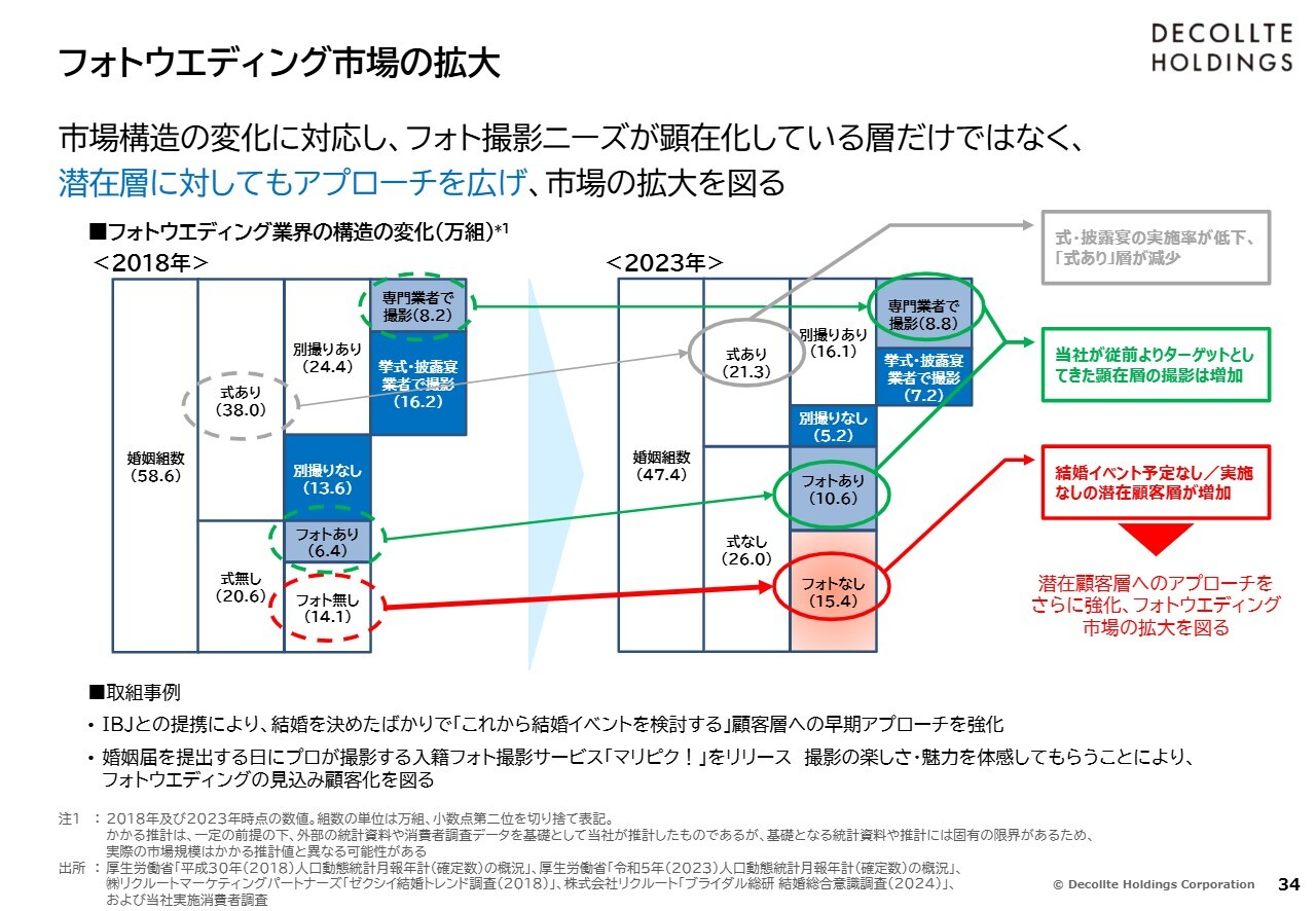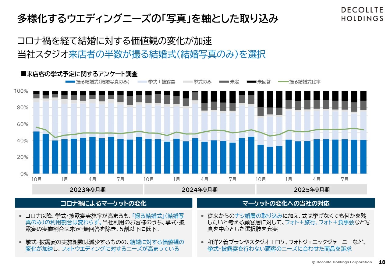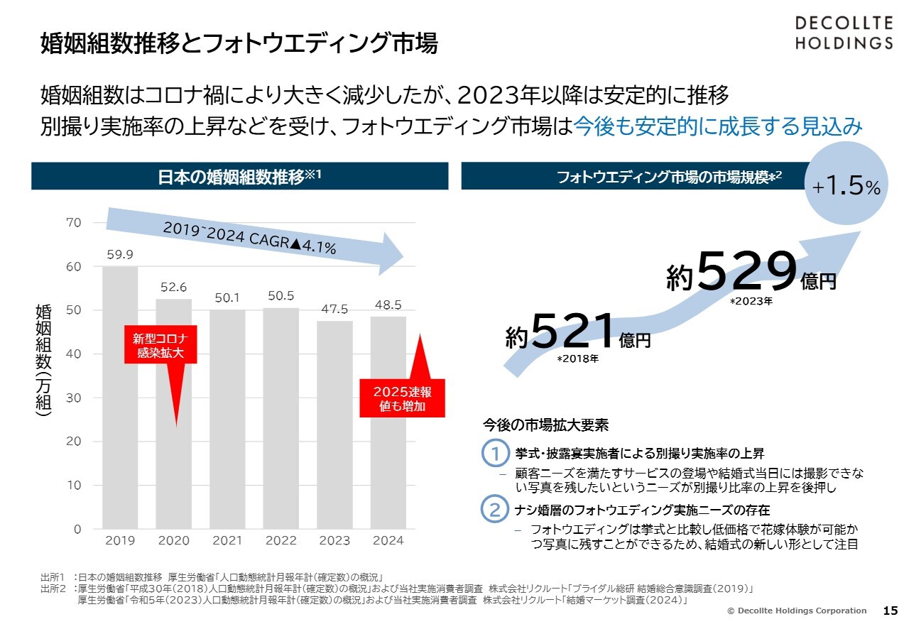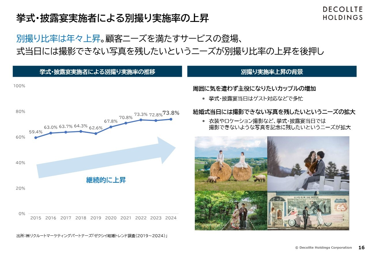 婚姻組数が減少する一方で、フォトウエディングの実施率を向上させる、あるいはスタジオ撮影に加えてロケーション撮影もされる方を増やすことを通じて、市場の拡大が見込めると考えています。